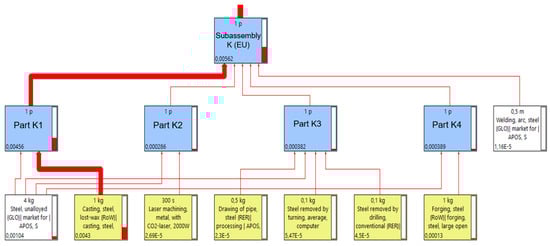 The ReCiPe 2016 Endpoint methodology was used in this work, which allows for the selection of intermediate or final indicators. The results displayed by the SimaPro tool show a list of emitted harmful substances. The amount of each emitted substance is expressed in the appropriate units. Additionally, the software displays the so-called process network, specifying the share of individual processes in the total harmfulness. A fragment of the process network of product A in the first variant (A_EU variant) is shown in Figure 4.