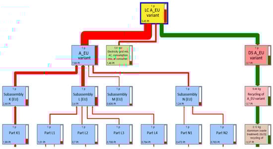 Most of the analyzed tools allow for the division of the processes performed into regions in which they are carried out. In the A_EU variant, it was assumed that the processes were performed in European countries, and at the end of the product life cycle, subassemblies K and L were recycled. Parts M2 and M4 from subassembly M are also recycled, while parts M1 and M3 go to a landfill. It was assumed that the parts that make up subassembly N will be recycled. In the A_RoW variant, on the other hand, the processes are carried out in Asian countries and no elements are recycled. The entire product goes to a landfill.