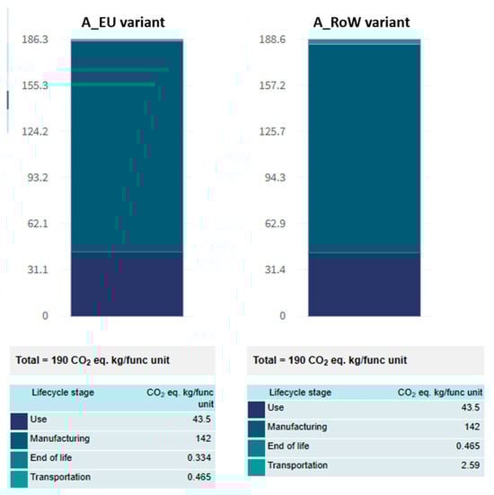 Two variants of product A were prepared. The first, called the A_EU variant, is manufactured and distributed in Europe, where the product is largely recycled, and the second, called the A_RoW variant (RoW—Rest of the World), is manufactured in Asian countries, imported to Europe, and stored in a landfill. In the case of the A_EU variant, road transport was assumed over a distance of 300 km (meeting the EURO 5 exhaust emission standard), while in the A_RoW variant, sea transport and container transport were assumed over a distance of 18,000 km.