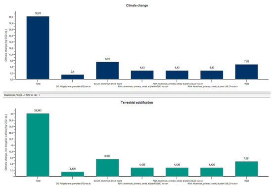 GaBi is a software also known as Sphera, dedicated to the analysis of the product life cycle []. Like other tools, it allows modeling the life cycle from the extraction of raw materials to disposal. It is distinguished by a rich database containing a wide range of materials, processes, and environmental indicators. The final results of the calculations are presented in the form of graphs, and the generated reports allow for the identification and optimization of areas requiring improvement. Examples of environmental assessment methods available in this tool are Eco-Indicator 99 and ReCiPe.