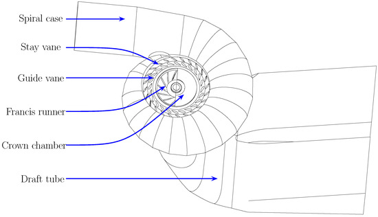 A completed geometrical model of the flow passage for the turbine unit is presented in Figure 2. The entire flow passage is constructed with the flow passages of the spiral case, stay vane, guide vane, turbine runner, draft tube, and the chambers of the crown and band.