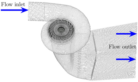 The Menter’s shear stress transport (SST) turbulence model, developed by Menter in the 1990s, is used to analyze turbulent flows in the turbine units. The Menter’s SST model combines the advantages of the and turbulence models to provide accurate predictions of flow characteristics, particularly in regions with adverse pressure gradients and separation [29,30].