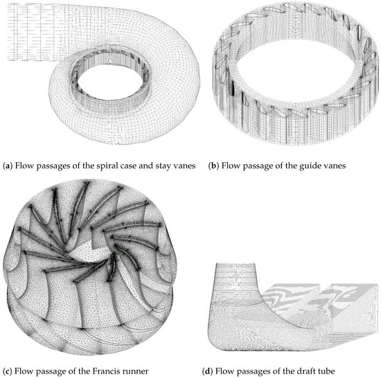 The flow of the turbine unit enters the spiral case at high pressure and velocity, and then, the stay vanes help direct the flow smoothly towards the guide vanes. The guide vane can be adjusted to control the direction and flow rate of the water entering the runner under different working conditions. By changing the guide vane opening, the flow direction in the guide vane passage can be better aligned with the flow direction of the runner to minimize energy loss and improve the efficiency of the hydraulic turbine. The runner is the key rotating component of the Francis turbine for energy conversion. As water flows drive the runner to rotate, the kinetic and potential energy of the water is converted into the mechanical energy of the rotating shaft system, and then, the rotating generator cuts magnetic lines and generates electricity. The draft tube is located at the outlet of the runner and ensures a smooth discharge of water downstream. It also helps to recover the kinetic energy of the water by gradually enlarging its cross-sectional area, reducing the flow velocity, and increasing the pressure of the outgoing water. The finite volume computational model of the turbine flow passages is established using structured and unstructured high-quality meshes (Figure 3 and Figure 4), and the meshes near the surfaces of the runner, stay vanes, and guide vanes, etc., are refined to achieve accurate and reliable predictions of turbulent flow in the turbine fluid passage.