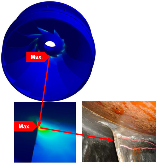 Flow-induced vibration and damage in Francis turbines have also been thoroughly studied by many experts [18,19,20]. Yao C. et al. [21] conducted a preliminary study of vibration measurements on a simplified hydraulic turbine model and proposed an innovative and promising distributed fiber-optic sensing technique to monitor strains in hydraulic machinery. Saeed R.A. et al. [22] observed fatigue cracks in a high-stress region at the trailing edge of Francis runner blades in their study. Luna-Ramirez A. et al. [23] analyzed the failure of a Francis runner and found that the damage was caused by a stress concentration at the T-joint between the blades and the crown, which was due to a combination of cavitation damage and high cycle fatigue when the machine was operated at low partial loads. Based on field measurements and simulations, Zhang D. et al. [24] studied the unsteady flow-induced stress of a high-head Francis runner. The results showed that the maximum flow-induced stress of the runner is closely related to factors including the pressure pulsation level, the speed of the pump–turbine unit, the number of guide vanes, and the number of runner blades. Some of the cracks in the Francis turbine runner blades were caused by turbine operating conditions that deviated from the design conditions [25]. A careful study revealed that the cracking of Francis runner blades can be caused by unevenness of the weld surface and accelerated by hydrogen embrittlement of the weld filler material [26]. Flow-induced resonance under off-design conditions and high stresses in Francis runners can also lead to cracks in runner blades [27].