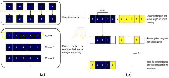 The input for the combinatorial GA consisted of a configuration of warehouses, which comprised a list of cities selected in the first stage. The dispatch city was excluded from this list, as it always served as the starting point of the route. These selected warehouses were assigned numerical categories that typically ranged from 1 to N, which correlated to the number of selected warehouses.
