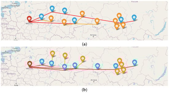 Figure 8b): Kazan, Kemerovo, Krasnoyarsk, Nizhny Novgorod, Perm, Tyumen, and Ufa. The linehaul routes and utilization rates for this solution were as follows: