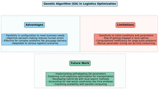 Figure 9 is a visual overview of the key aspects of the GA approach in logistics. It highlights three main categories: advantages, limitations, and future directions. Each category is explained with key factors that influence the effectiveness of the GA in optimization tasks, offering a clear view of how different elements interact and potential avenues for improvement.