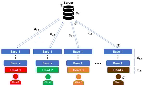 Therefore, the need for suitable personalization methodologies arises to capture and optimize each client’s unique data characteristics. To address these issues, personalized federated learning (PFL) approaches [4,5] are actively being researched. This study utilizes representation learning, which is one of the PFL approaches. Representation learning divides the layers of a deep learning model into base and head components. In representation learning, the base (or feature extractor)part represents common features for all clients and is shared with the server and all clients. The head (or classifier) part represents unique features for specific clients and remains on the local device, not shared with the server. Typically, the head part uses the last fully connected layer (classification layer). In our experimental setup, this work also designates the head part as the last fully connected layer while setting the remaining layers as the base part. Therefore, the need for suitable personalization methodologies arises to capture and optimize each client’s unique data characteristics. To address these issues, personalized federated learning (PFL) approaches [4,5] are actively being researched. This study utilizes representation learning, which is one of the PFL approaches. Representation learning divides the layers of a deep learning model into base and head components. In representation learning, the base (or feature extractor) part represents common features for all clients and is shared with the server and all clients. The head (or classifier) part represents unique features for specific clients and remains on the local device, not shared with the server. Typically, the head part uses the last fully connected layer (classification layer). In our experimental setup, this work also designates the head part as the last fully connected layer while setting the remaining layers as the base part.