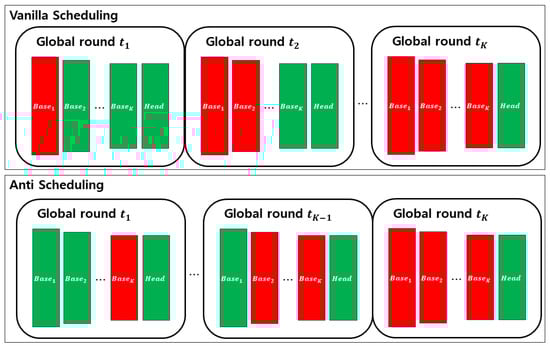 Lines 9–13 describe the Anti Scheduling mode operations. In Anti mode, as line 10 indicates, if the current global round t exceeds the layer unfreeze round , the algorithm unfreezes the ()-th base parameter , which is closer to the head layer. In line 13, the unfrozen base parameters are used for the local update. In lines 15–16, the head is frozen while sending the updated base parameters to the server. In line 18, global aggregation is done after local updates, and fine-tuning is done in lines 20–24, where both base and head parameters are utilized in each client after the global rounds are complete.