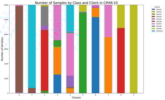 In our experimental setup, the total number of clients N is set to 100, with each round involving a client participation ratio r of 0.1, indicating that 10 clients participate in each training round. The batch size is configured to 10, and the learning rate is set at 0.005. The datasets used in our experiments include MNIST, which consists of 70,000 grayscale images of handwritten digits (0–9) with a resolution of 28 × 28 pixels; CIFAR-10, containing 60,000 color images of size 32 × 32 pixels across 10 classes, such as airplanes, birds, and cars; CIFAR-1000, which is similar to CIFAR-10 but includes 60,000 images spanning 100 classes, organized into a hierarchy of 20 superclasses; and Tiny-ImageNet, a dataset consisting of 200 classes with 500 training images and 50 validation images per class, each resized to 64 × 64 pixels. To induce heterogeneity among the data distributed to each client, this work sampled from a Dirichlet distribution with a Dirichlet parameter of 0.1, establishing a highly heterogeneous environment. This approach to data distribution is visualized in Figure 3, which illustrates the results of sampling the CIFAR-10 dataset among 10 clients. Despite the high heterogeneity induced by the Dirichlet parameter of 0.1, MNIST, and CIFAR-10 datasets inherently lack significant class heterogeneity. Therefore, our experiments focus on the CIFAR-100 and Tiny-ImageNet datasets because our approach performs well in environments with substantial data and class heterogeneity. The CIFAR-100 dataset contains 100 different classes, and the Tiny-ImageNet dataset contains 200 classes.