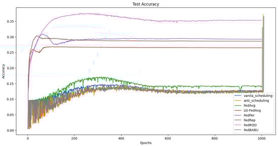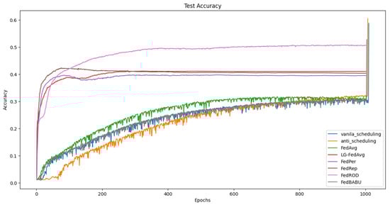 Similarly, Figure 5 represents the average accuracy of clients on the Tiny-ImageNet dataset. Our scheduling algorithm’s earlier round accuracy is lower than FedAvg and FedBABU, which is consistent with its characteristics. This visualization helps underscore how our scheduling algorithms gradually catch up and potentially surpass other algorithms as the training progresses.