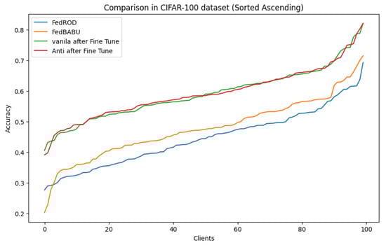 Comparison of client-specific accuracy in the CIFAR-100 dataset. This figure visualizes the accuracy of each client in ascending order.