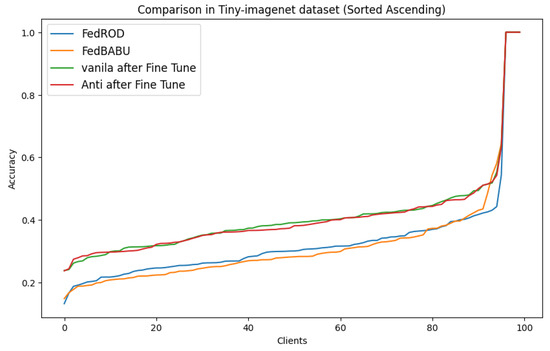 Comparison of client-specific accuracy in the Tiny-ImageNet dataset. This figure visualizes the accuracy of each client in ascending order.