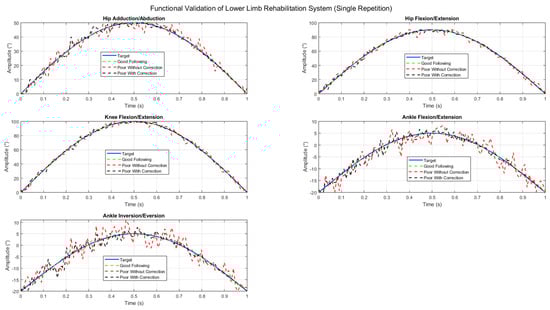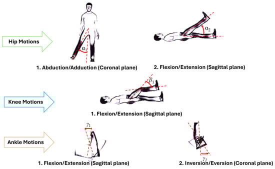 The movements targeted by the LegUp during the lower limb rehabilitation process are illustrated in Figure 1. The amplitudes for these motions were previously established based on the joint movement measurements taken from healthy subjects, as summarized in Table 1.