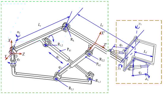 The hip–knee module (green rectangle in Figure 2) is composed of three active joints; revolute joint q1 performs the hip adduction–abduction motion by revolving the entire kinematic mechanism around the OX axis, and the revolute axis of this joint is perpendicular to the patient coronal plane when the patient is laid on his back. The prismatic joints q1 and q2 are responsible for executing the flexion/extension on the hip and the flexion extension of the knee, respectively. For performing the flexion and extension of the hip, the two joints have to move in a synchronized manner in order to rotate the hip of the patient around the OY axis without modifying the knee joint angle. For the flexion and extension of the knee, the q1 joint is placed at a 45-degree angle and remains still, while the q2 joint performs the knee joint motion. The hip–knee module contains several passive joints; the α2 revolute joint is parallel with the sagittal plane of the hip joint and allows for hip flexion and extension. Revolute passive joints R11, R12, R21, R22, and Rk allow hip–knee motions to be performed with the help of q1 and q2 joints.