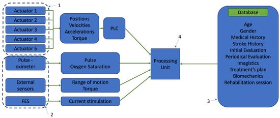 Subsystem 3: This subsystem consists of a previously developed database that contains personal details such as age, gender, medical history, stroke history, initial evaluation, periodical evaluation, imaging analyses, a treatment plan prescribed by the doctor, biomechanical data, and the schedule for the rehabilitation session.