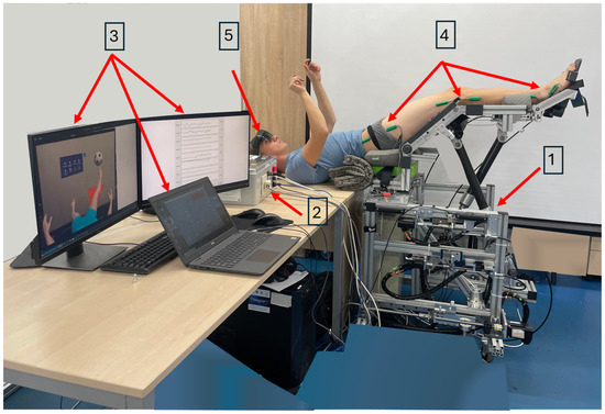 Robot-Assisted Therapy setup integrating the LegUp rehabilitation robot (1), The control system (2), The User interface with the control’s commands for the parallel robot, streaming from HoloLens and graphics from sensors (3), Biometrics sensors placed on the patient’s leg (4), HoloLens 2 device (5).