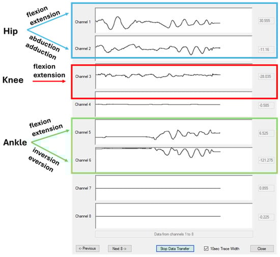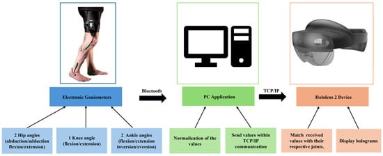 Real-time data are transferred via Bluetooth to a PC application from the electronic goniometers which measure two hip angles (abduction/adduction, flexion/extension), one knee angle (flexion/extension), and two ankle angles (flexion/extension, inversion/eversion). After normalizing these values, the PC program uses the TCP/IP protocol to send the normalized data to the HoloLens application. In this setup, the HoloLens program acts as the server while the PC application serves as the client.