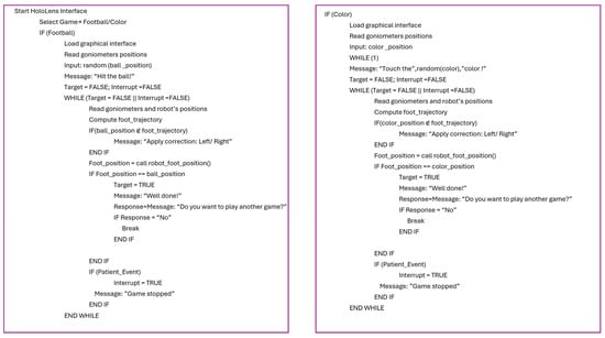 Figure 7 presents a pseudo-code structure that outlines the process of interaction in a HoloLens interface designed for rehabilitation games, specifically for two modes: “Football” and “Color”. The flow starts with the selection of the game mode (Football or Color), and depending on the choice, different steps follow. For Football, the system loads a graphical interface, reads the patient’s foot positions via goniometers, and prompts the patient to hit a ball. The program continuously monitors the foot’s trajectory and corrects it if necessary, aiming for the foot to hit the ball. If the target is reached, a success message is displayed. An interrupt can stop the game based on patient events.