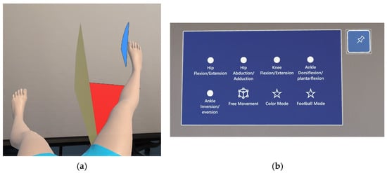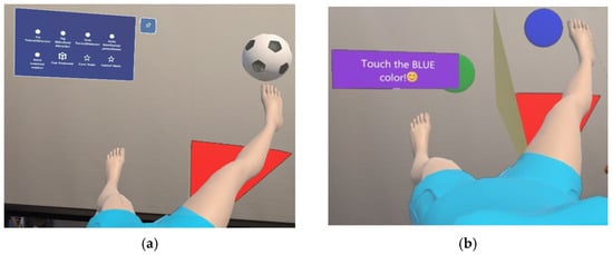 (a) Football Mode: the patient interacts with a ball, simulating a football scenario; user interface (left); the range of motion of the robot-hip duction/abduction (red area). (b) Color Mode: the patient interacts with colors. The task requirements are displayed as a message and are also communicated via audio (in the HoloLens device).