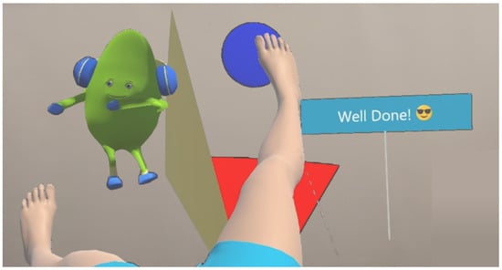 Given that LegUp is intended for bedridden patients, the game was designed to provide the patient with the necessary visual stimulus, taking into account psychological factors such as motivation and engagement, sense of control and autonomy, and social interaction and support [29,30]. To deliver this visual stimulus, digital goniometers measure dynamic joint movement across two planes simultaneously, transmitting these angles to the developed application. In the application, a virtual model performs leg movements based on the received angles, displaying the holograms through a HoloLens 2 device (Figure 5). The entire scene can be also visualized by the therapist through the LegUp user interface, which features real-time streaming from the HoloLens device.