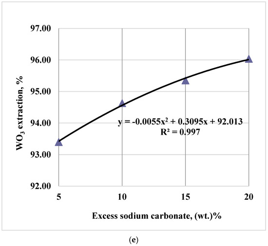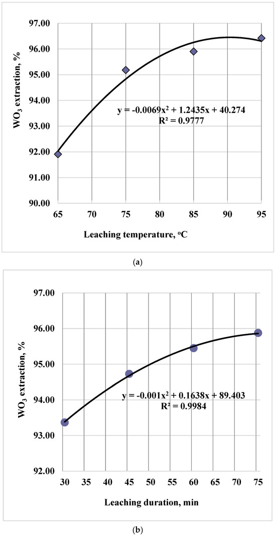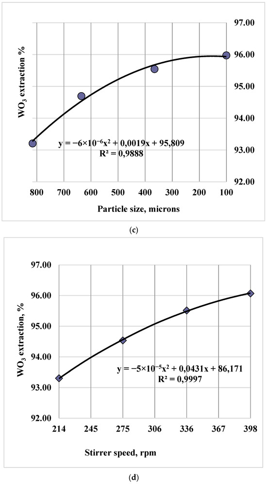 Processing of experimental data made it possible to identify the dependences of tungsten trioxide leaching into solution and the trend equations presented for the sinter obtained at 750 °C in Figure 1a–e.
