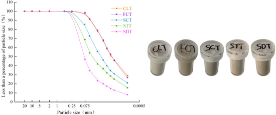 In this paper, cylindrical glass tubes with a diameter of 9 mm and a height of 30 mm that meet the requirements of the CT testing machine were used to collect tailings samples with different particle sizes. Clay tailings are abbreviated as CLT, clay tailings in iron ore are abbreviated as FCT, silty-clayey tailings are abbreviated as SCT, silty tailings are abbreviated as STT, and sandy tailings are abbreviated as SDT. In the following paper, different types of tailings samples are discussed by abbreviation. The porosity of the sample was measured by mercury intrusion test; the sample was saturated with vacuum to make its saturation greater than 95%, and then the permeability coefficient was measured by the indoor variable head test. The basic physical parameters of each sample are shown in Table 1, and the gradation curve between the sample and the particle is shown in Figure 1.