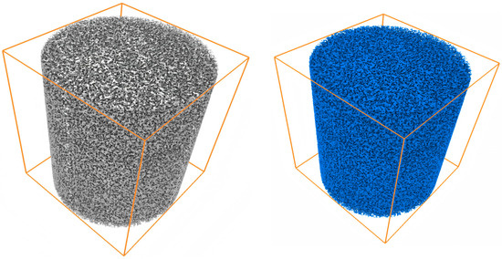 The processing of digital images consists of two parts: pre-processing and threshold segmentation. The purpose of pre-processing is to eliminate the noise part of the experimental process and retain some small details in the original image, so as to improve the clarity of image restoration. Threshold segmentation is based on the fact that different phases will correspond to different gray value ranges, so as to divide their corresponding voxel sets to obtain different regions, and these regions have the same properties inside, so as to extract the part we need. The brightness difference method and binarization are used to output all the data within the selected threshold range as 1, and the rest of the data are output as 0. As shown in Figure 3, the binarized black and white image data and the corresponding 3D model can be obtained, in which the black dots are pores and the white is the matrix.