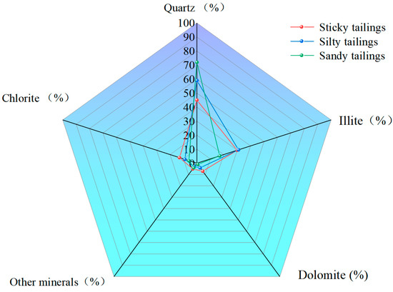 The gray value of the same substance has a large range and is not a single value, and the key to threshold segmentation lies in how to accurately find a suitable threshold. The gray value of the pixel is repeatedly compared with the selected threshold, so as to distinguish the target area into different parts. In order to avoid errors in quantitative analysis due to improper selection of thresholds, the optimal threshold was determined by referring to the porosity ratio obtained from the experiment. In the original 2D CT grayscale image, the black ones are pores, the highlighted white material is minerals, and the rest of the gray ones are soil-like matrices. In order to render the tailings model more clearly, the mineral composition contained in it was tested. XRD diffraction tests were performed on three different types of tailings using the D8 Advance X-ray diffractometer (Bruker AG, Berlin, Germany), and the mineral composition was mainly composed of quartz, chlorite, dolomite, illite, and trace amounts of other components, such as calcite, metallic minerals, etc. The test results can be seen in Table 3, which is plotted as a five-dimensional radar distribution map, as shown in Figure 5.