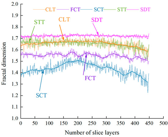It can be seen from Figure 11 that the fractal dimensions of CLT, FCT and SCT clay tailings particles were between 1.2 and 1.7; they fluctuate greatly with the number of slice layers, and STT and SDT fluctuate around 1.7 without obvious change. The results show that the smaller the particle size, the smoother the surface, and the lower the surface fluctuation in the clay particles.