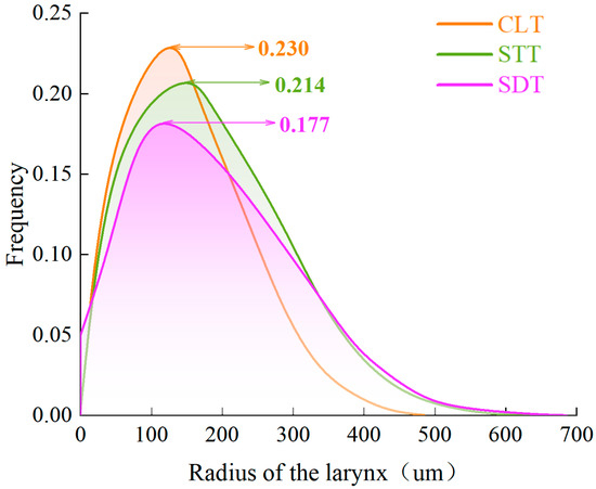 As can be seen from Figure 14, the probability distribution of the laryngeal radius tends to be normally distributed, and the peak frequency and concentration of the radius distribution decrease from CLT to STT and then to SDT, and the permeability should tend to increase, which is in line with conventional thinking.