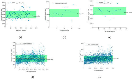 Scatter plot of throat length distribution of samples. (a) CLT; (b) FCT; (c) SCT; (d) STT; (e) SDT.