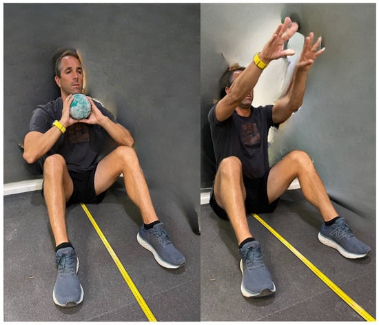 Participants were instructed to push the ball as far as possible away from their chest using a chest pass technique [14,19]. After three practice throws and a 3 min rest, three recorded repetitions were performed with 90 s rests between each [8,11,14]. The throwing distance was measured from the wall to the farthest edge of the chalk mark, and the mean of three trials was calculated [8,11,14].