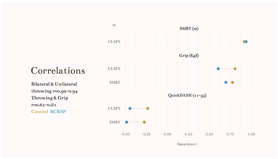 A good correlation was found between the throwing tests and grip strength in the control group (r = 0.78–0.81), and a moderate correlation was found in the RCRSP group (r = 0.61, 0.7). Mild significant associations were found between the throwing tests and QuickDASH in the RCRSP group (r = (−0.48)–(−0.44)). Fear avoidance was mildly associated with SMBT and ULSPT in both groups (SMBT: control r = −0.29, p = 0.03; RCRSP r = −0.39, p = 0.02; ULSPT: control r = −0.42, p = 0.02). Only a low correlation was found between SMBT and past-week VAS (r = −0.37, p = 0.05) in the RCRSP group.