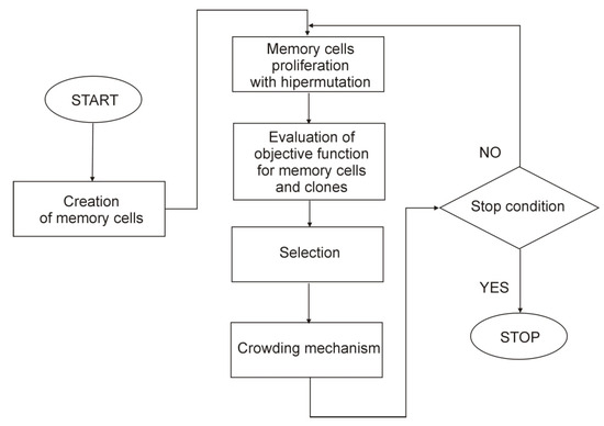 Numerous techniques, such as the clonal selection mechanism or the mechanisms of positive and negative selection, can be used to build an AIS [40]. The developed algorithm based on the clonal selection mechanism is explained in Ref. [41]. In Figure 1, this algorithm is displayed. The memory cells are created at random in the initial stage. This algorithm is run multiple times for different random values, which guarantees the algorithm’s effectiveness. Mutations and proliferation lead to the creation of new memory cells. The value of the objective function for a particular memory cell determines how many clones are made of that memory cell. The objective function value for every memory cell is then calculated.