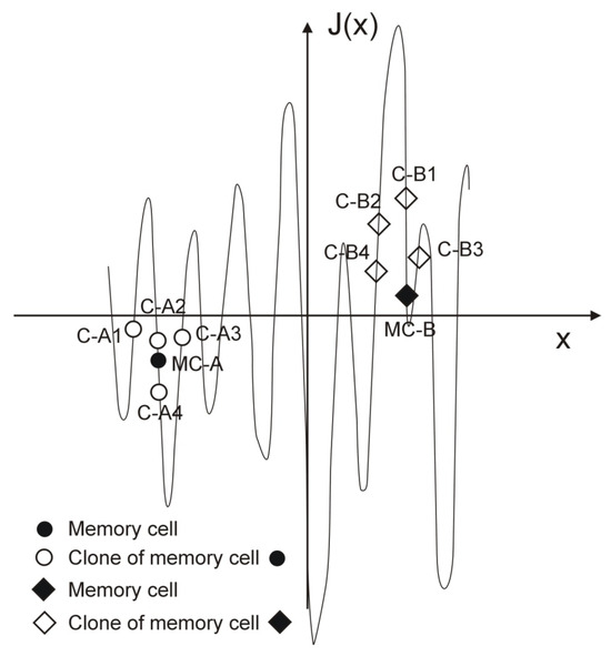 where —the number of memory cells; —the number of clones; —the size of the entire population of memory cells; and —the population of clones.