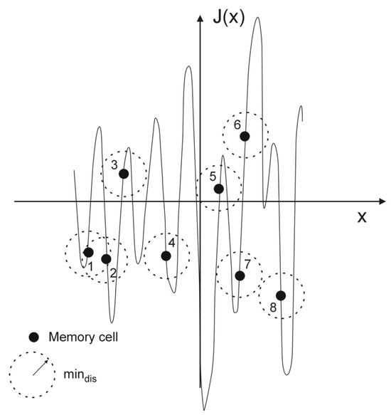 In the next step of AIS creation, the value of the objective function for all memory cells is calculated. Replacing ineffective memory cells with more productive clones is the aim of this selection. Some memory cells are swapped out for superior memory cells throughout the selection process. Selection on the basis of the geometrical distance between each memory cell and clones (measured by using decision variables) is performed (Figure 2). The selection process based on the two memory cells “MC-A” and “MC-B” is then described. Four clones are made for each of the memory cells “MC-A” and “MC-B,” ranging from C-A1 to C-A4 and C-B1 to C-B4, respectively. The clones of each memory cell are compared (the objective function is compared). The clone C-A4 and the memory cell MC-B are chosen in this comparison with the subsequent iteration (to attain a better value of the objective function). Repeating this process is necessary for every memory cell. The immune algorithm’s final stage of the main loop makes use of the crowding mechanism. Because it preserves the population’s diversity of memory cells, this mechanism is crucial to the optimization process. By means of the crowding mechanism, memory cells that are comparable are eliminated. The similarity is also determined as the geometrical distance between two memory cells (Figure 3) measured using the parameter mindis. Only memory cell “2” is in the similarity area during the crowding mechanism procedure for memory cell “1,” meaning that the better memory cell (“2”) is retained in the population while the worse memory cell (“1”) is deleted. Finally, a new memory cell is generated randomly. The other memory cells are outside of its similarity area. These memory cells remain in the population of memory cells.