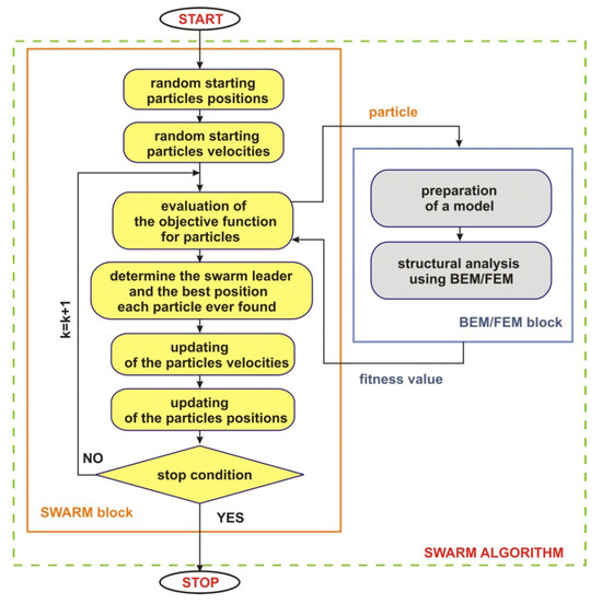 Figure 5 displays the PSO flowchart. The procedure starts with a randomly generated particle swarm of the presumptive size. The starting positions and velocities of the particles are created randomly. In the next step, the objective function values are evaluated for each particle. The data necessary for the calculation of the objective function are obtained in consequence of solving the boundary value problem. The swarm leader is selected once the optimal particle placements have been updated based on the fitness information of every particle. Next, (8) is used to modify the particle velocities, and (9) is used to modify the particle placements. Until the stop condition is met, the procedure is repeatedly carried out iteratively. The maximum number of iterations is usually used to describe the stop condition. Essentially, every particle oscillates in the search space between its previous best position (the position with the best fitness function value) and the best position of its best neighbor (the relative swarm leader). The idea is that each particle will find the new best positions (solutions) on its trajectory, which will ultimately lead to the optimal solution in a specific area.