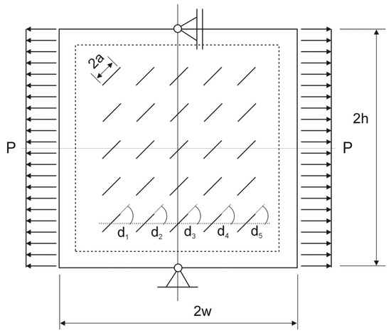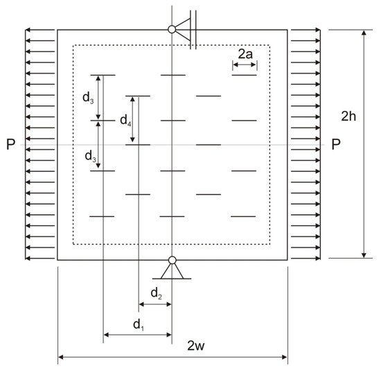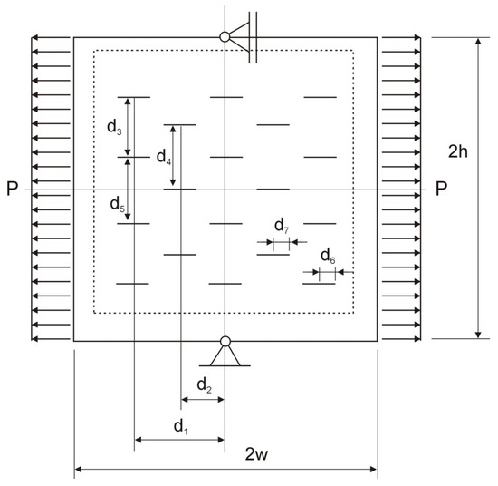 A third example of the optimized composite is presented in Figure 12. The geometrical parameters are the same as in the previous example. The square plate is simply supported and uniformly loaded by traction P in the horizontal direction. The difference is the number of fibers and the possibility of their modification. A square plate contains 18 fibers in five columns (three columns with 4 fibers and two with 3 fibers) as shown in Figure 12. The fibers in the square plate are distributed symmetrically in the horizontal and vertical directions. The length of each fiber is 2a. The decision variables for this example determine the distribution of fibers described by four parameters: d1, d2, d3, and d4. The composite is discretized using 260 boundary elements (80 for the external boundary and 10 for each fiber). The aim of optimization is to minimize or maximize the effective elastic Young’s modulus in the direction of loading.