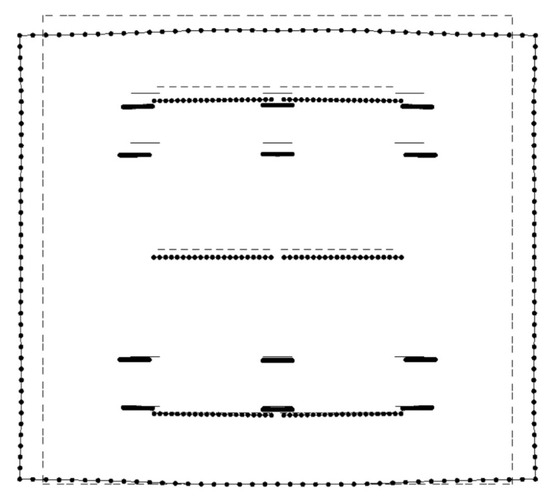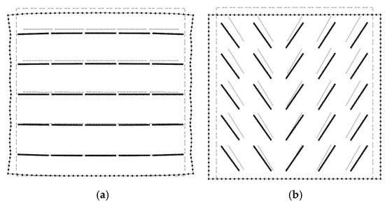 The external boundaries of the plate and the fibers are split into boundary elements in order to obtain the numerical solution by BEM. Nodal values and quadratic shape functions are used to interpolate the displacements, traction, and coordinates of external boundaries and the traction operating on the fibers. Because the fibers are straight and stiff, the displacements and coordinates are not interpolated. The relations between nodal displacements and traction are established by substituting the interpolated displacements, traction, and coordinates into the boundary integral [47]. Nodes along the outside edges of the plate and the fibers are known as collocation points.