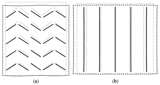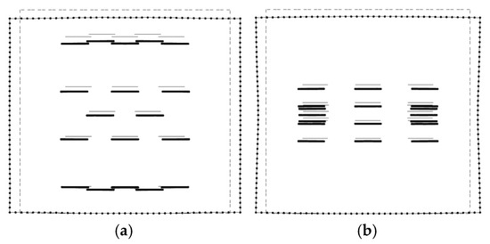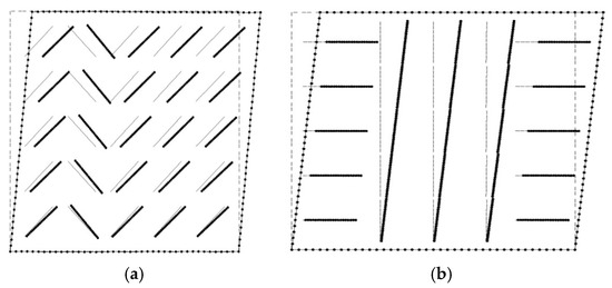 The result of maximizing and minimizing the Young’s modulus using AIS and PSO was the same. The results of the maximization after 71 iterations and also the minimization after 30 iterations in the form of the optimal distribution of rigid fibers are presented in Figure 13. The number of objective function evaluations for the maximization problem was 8550 for AIS and 9260 for PSO, while for the minimization problem it was 20,235 for AIS and 17,450 for PSO. On the basis of the obtained results, it can be concluded that the stiffest composite is obtained when the fibers are placed in several distant lines (Figure 13a). Conversely, the worst solution is when all the fibers are close together (Figure 13b).