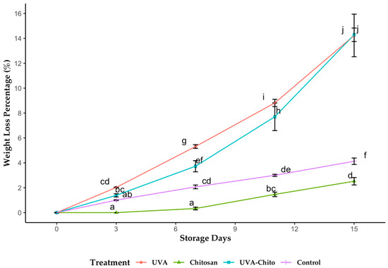 Effects of postharvest treatments on weight loss. Each treatment contains three replicates. Bars indicate values are the mean ± standard deviations of replicates. Different letters correspond to mean values significantly different (p < 0.05) by analysis of variance (ANOVA) and Tukey post hoc test across storage.