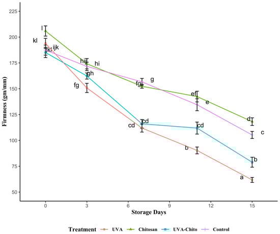 Blackcurrant berry firmness changes during storage. Each treatment contains three replicates. Bars indicate values are the mean ± standard deviations of replicates. Different letters correspond to mean values significantly different (p < 0.05) by analysis of variance (ANOVA) and Tukey post hoc test across storage.