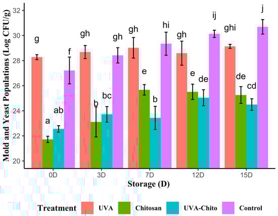 The results (Figure 3) on yeast and mold populations of blackcurrants during storage indicated on day 0, chitosan with or without UVA treatment already had an impact on yeast and mold populations. The reduction in yeast and mold populations at the beginning stage might have been because of the coating of chitosan. On day 3, chitosan’s impact on yeast and mold populations was not significantly different from that of chitosan combined with UVA, and the population was below 24 Log CFU/g on average. Both the control and UVA had higher yeast and mold populations (>28 Log CFU/g on average) on day 3. The UVA–chitosan influences were significantly different from the chitosan treatments on day 7. Chitosan combined with UVA had higher efficiency of antifungal activity, although the influences were not significantly different from chitosan itself on both day 12 and day 15. On the other hand, UVA had few inhibition capabilities compared with the control treatment before day 12. The UVA treatment’s impact on yeast and mold populations was only significantly different from that of the control treatment at the later stages (day 12 to day 15) of postharvest. During storage, large amounts of yeast and mold populations were detected in both the UVA and control treatments. Generally, UVA had less impact on controlling fungal populations, whereas chitosan or chitosan combined with UVA (UVA-Chito) had a strong inhibition effect in blackcurrant postharvest treatments. High-molecular-weight chitosan fractions could destabilize the fungal cell membranes, and low-molecular-weight fractions of chitosan could penetrate fungal cells and disturb cell processes [42]. In this study, low-molecular-weight chitosan was used. Its higher solubility and lower viscosity made it easier to coat small blackcurrant berries. Further alternative LED lights may be applicable in the future with light spectrums such as UVC. The integration of UVC has been extensively studied for postharvest contamination and preservation, specifically controlling yeast and mold growth during storage [43].