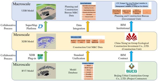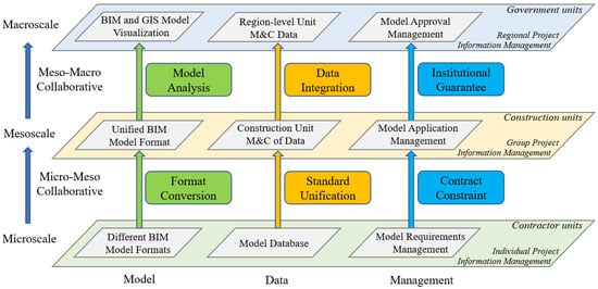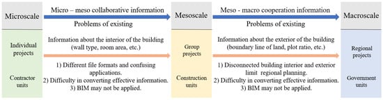 9]. In the process of engineering construction, various information needs are transmitted among different scales. For example, micro–meso (referring to the business involved in the transition from microscale to mesoscale) information includes information about the interior of the building (e.g., wall type, room area, etc.), and meso–macro (referring to the business involved in the transition from mesoscale to macroscale) information includes information outside the building (e.g., boundary line of land, plot ratio, etc.). Challenges exist in the process of information collaboration among different scales, as shown in