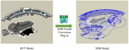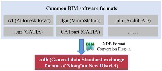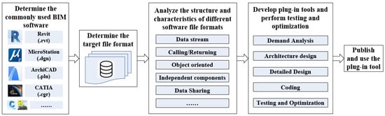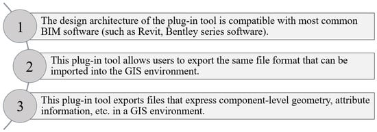 Figure 5. Firstly, the plug-in’s design architecture needs to be compatible with various common BIM software in order to ensure its universality in the engineering industry. Secondly, the plug-in needs to export the same model file format, facilitating the unified management of files by construction units and government units. Thirdly, the exported file format needs to be able to be imported into a GIS environment and fully express the important information of BIM models and components, ensuring the integrity of the main information of the project and preparing for the fusion and display of subsequent project scenarios.