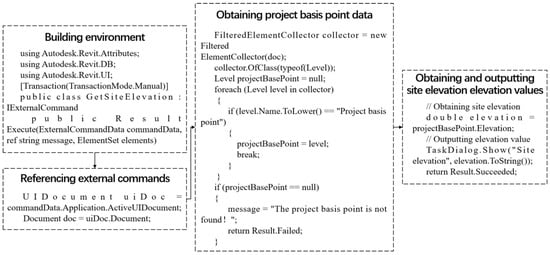 For example, to obtain the enclosed area data for rooms above ground in a Revit model, the contractor unit can set the area parameters in the software based on the unified data classification and coding system and assign them coding information. At the same time, a class library can be created in Visual Studio, and Revit-related references can be added. Using the C# language to write the corresponding code, generating a solution (.dll file), and then installing and running the corresponding .dll file in Revit after installing the Revit SDK tool package can extract site elevation coding data for the contractor unit and the construction unit to view and process. The main code for obtaining the enclosed area data for rooms above ground is shown in