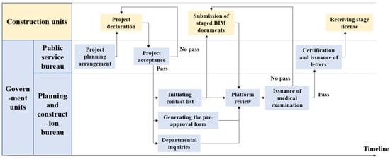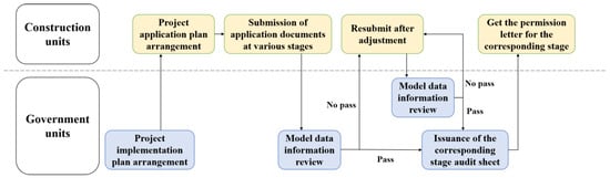 In combination with regional space resource assessment, demand prediction, development scale, and overall layout of planning, the government units formulate the approval of institutional guarantees based on BIM and GIS, which can effectively promote the application of BIM and GIS in the local area. In this method, the construction units upload the required information model and relevant documents to the government units in each stage of the land planning permit, project construction permit, construction permit, and complete acceptance of engineering construction projects according to the regulations. The government unit can judge whether the project meets the planning requirements and can approve it according to the information of the land area and specialty category of the project model, which makes the construction application and approval process of the organization more automatic and transparent. The application of BIM and GIS should be placed in the institutional policy, so as to guarantee the implementation of BIM and GIS and promote the construction and development of regional informatization. The approval process for construction unit declaration documents by government units is shown in