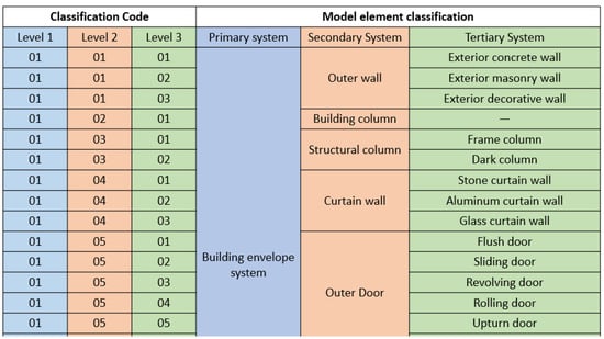 29]. Based on the characteristics and attributes of engineering information content, it should be classified according to a certain logic and method, and a certain classification system should be established to ensure that each element or component has a unique identification code and the connection between BIM model elements, components, and data coding system is realized.