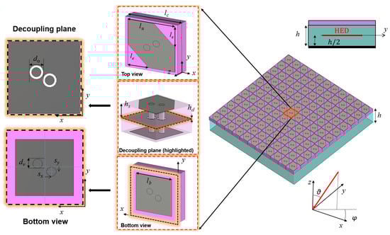 The antenna structure is presented in Figure 1, as well as a detailed zoom on the PCM unit cell. Three main components should be distinguished: the PCM, the ground plane, and a simple horizontal electric dipole (HED) oriented along the y axis and placed in the middle of the cavity to have maximum gain [44,45]. Here, we consider both the ground plane and the PCM of infinite extent without taking into account possible truncation effects, as is typical for leaky-wave antennas with high aperture efficiency [14]. As concerns the source, an FPCA is commonly fed by any LP dipole-like radiator [22]. The use of a horizontal magnetic dipole (HMD), typically implemented through a resonant slot on the ground plane [46], or an HED, usually in the form of an L-shaped probe [22], allows for obtaining the broadside pencil beam, which are instead not possible with vertical dipole sources [14].